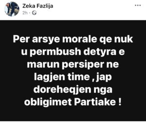 “Për arsye morale, që nuk u përmbush detyra e marrë përsipër në lagjen time, jap dorëheqjen nga obligimet partiake,”, ka shkruar ne Facebook Fazlija.