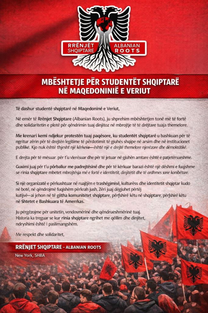 Në emër të Rrënjet Shqiptare (Albanian Roots), ju shprehim mbështetjen tonë më të fortë dhe solidaritetin e plotë për qëndrimin tuaj dinjitoz në mbrojtje të të drejtave tuaja themelore.